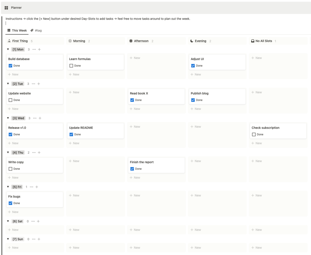- Have a visual grid of all 7 weekdays pre-set -> to drag and move tasks around with ease.